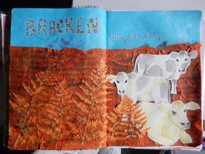 Before we discovered the spores of bracken are carcinogenic we used it in many ways. It was used as fodder, packaging, soap, briquettes for fuel and bedding for livestock. Since I often see cattle in the fields along the coast I decided to make a journal spread inspired by the use of bracken as bedding for livestock.