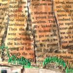 To add embroidery to my page to create texture on the pieces of ‘wood’ I make 2 shapes from copy paper and then collage these with pages from a book (click on image below to see full sized picture of this and the embroidery). I use Neocolour crayons to add wood patterns and blend these out with a baby wipe. I would have added more embroidery but my machine has a fault and isn’t running very well. (I have since replaced it).